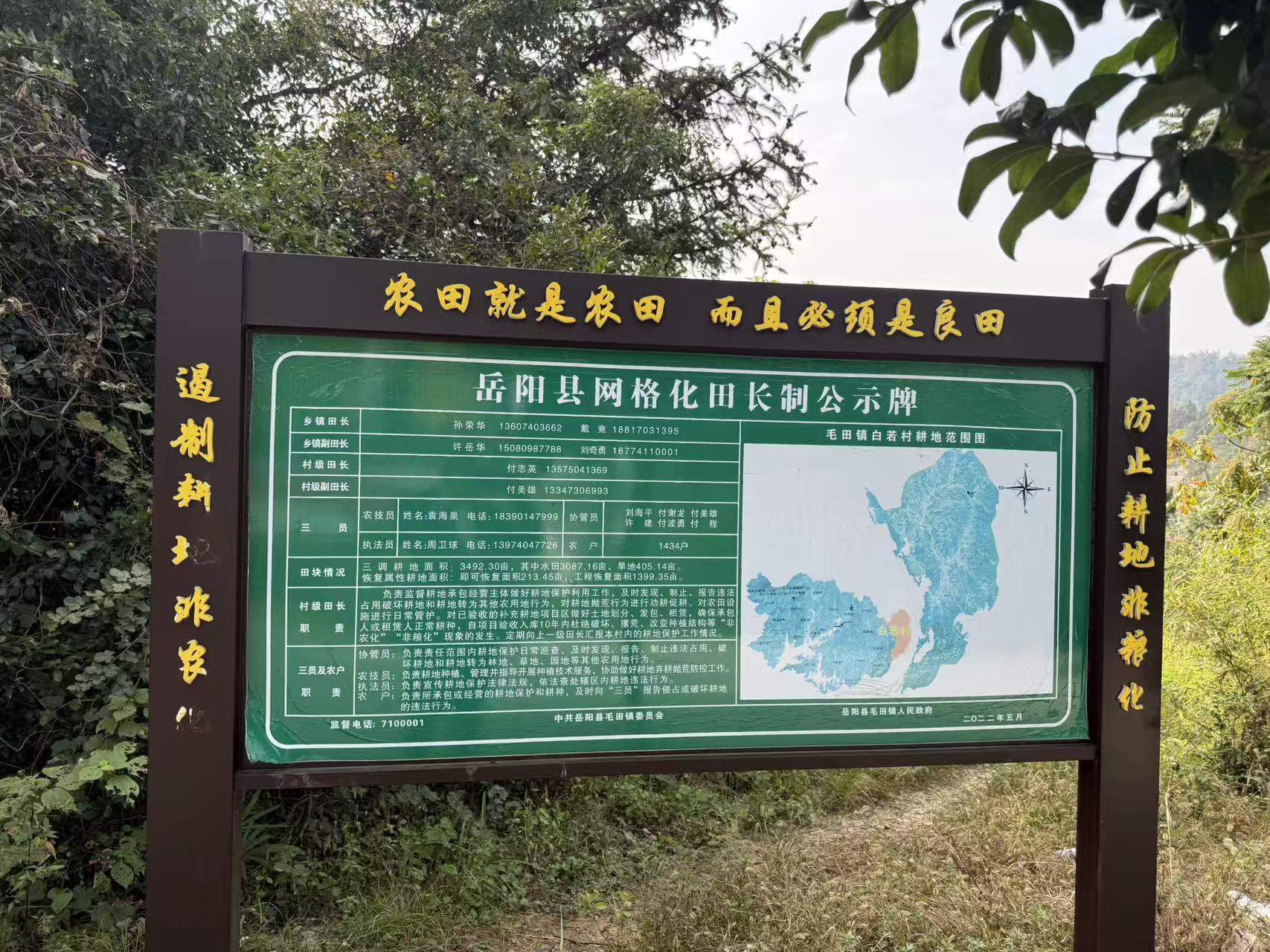 村头那块“山洪灾害防御预案”的牌子,是白若村对自然的敬畏书。转移路线图上的红线,像一条条生命线,在地图上勾勒出逃生的希望。而在田野间,“农田就是农田 而且必须是良田”的标语牌下,网格化田长制公示牌详细记录着每一块耕地的“守护者”——乡镇田长孙荣华、村级田长付志英、副田长付美雄,还有农技师、执法员、协管员组成的“三员”队伍,共同编织着耕地保护的网。