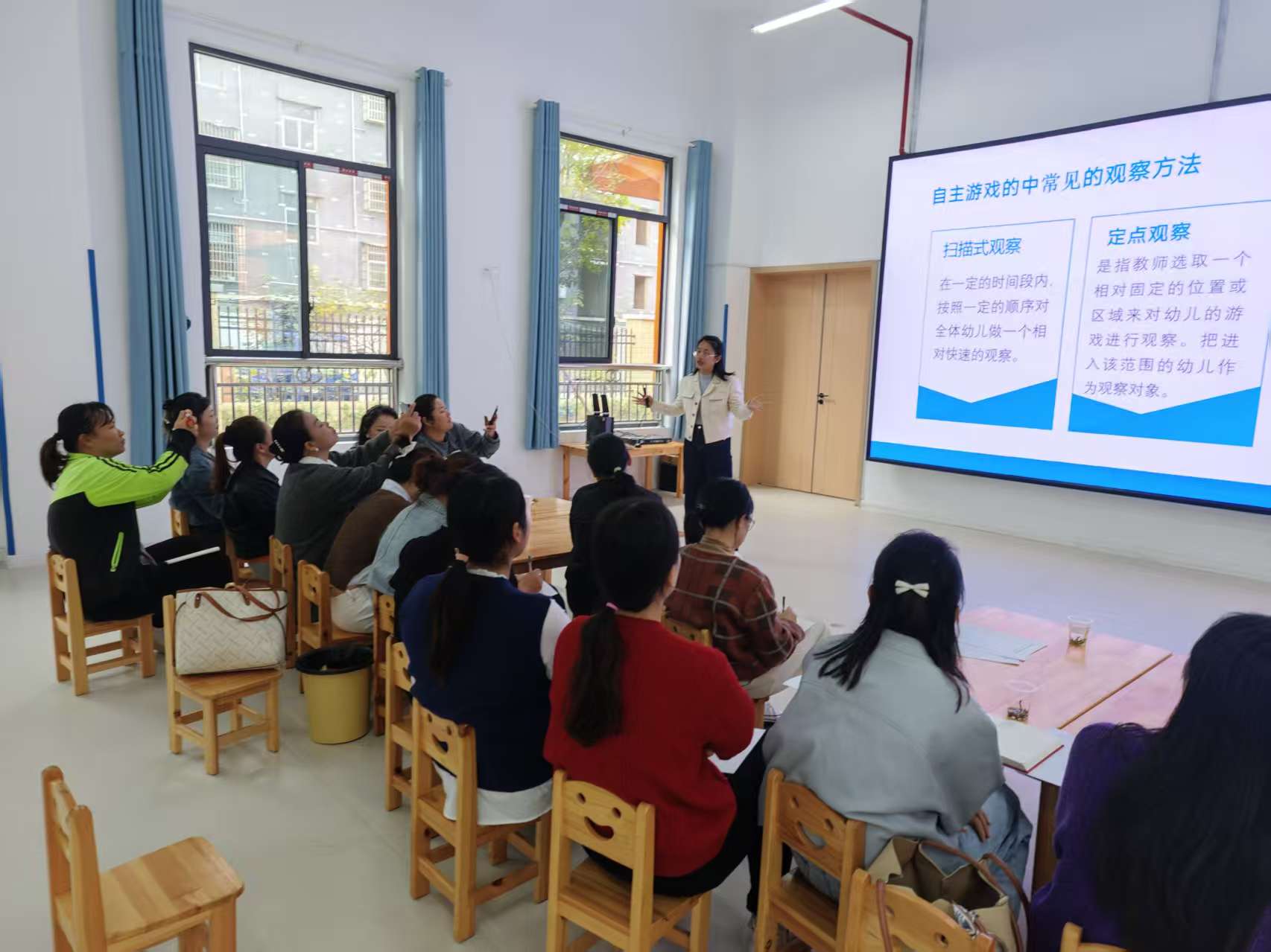 观摩结束后,岳阳县中心幼儿园刘臻主任带来《观察·分析·支持》专题培训讲座。她强调,自主游戏中教师的观察是“读懂儿童”的艺术,记录是“对话童心”的语言,分析是“理解行为”的能力,指导是“助力成长”的智慧,四者共同构成了连接教师与幼儿的重要桥梁。讲座中,刘臻主任围绕观察记录与分析的撰写要点,从观察方法、观察内容、记录类型、行为实录撰写、分析维度及支持策略等方面进行了系统解读,为在场教师提供了扎实的理论支撑与实践指引。