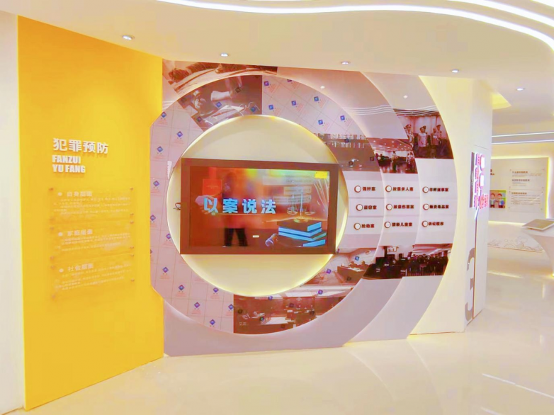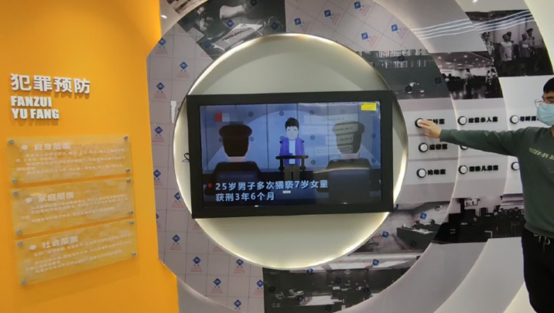 在“以案说法”区域,墙面上整齐排列着9个实物按钮,每个按钮对应一个案例。参观者点击按钮后,65寸交互设备即刻播放该案例的动画视频,以生动直观的方式呈现法律后果,起到警示和教育双重作用。