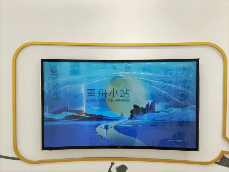 青舟课堂配备85寸触摸电子白板,连接4个吸顶喇叭,支持文字、图片、视频、音频等多种内容形式的展示。这里既是检察官开展法治讲座的主阵地,也是学校组织集体参观时的集中学习区域,实现了“参观+教学”的双重功能。