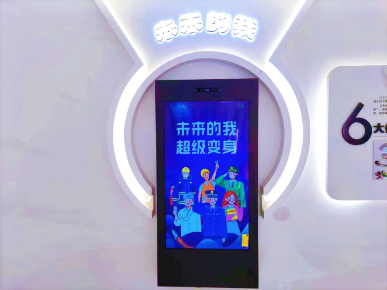 “未来的我-超级变身”是我们为该项目定制开发的明星互动装置。采用65寸定制一体机配合KINECT体感交互设备和高性能图形处理工作站,系统能够精准识别人体手部动作,参与者只需简单挥手,即可在屏幕上“变身”为法官、检察官、警察等法律职业形象。