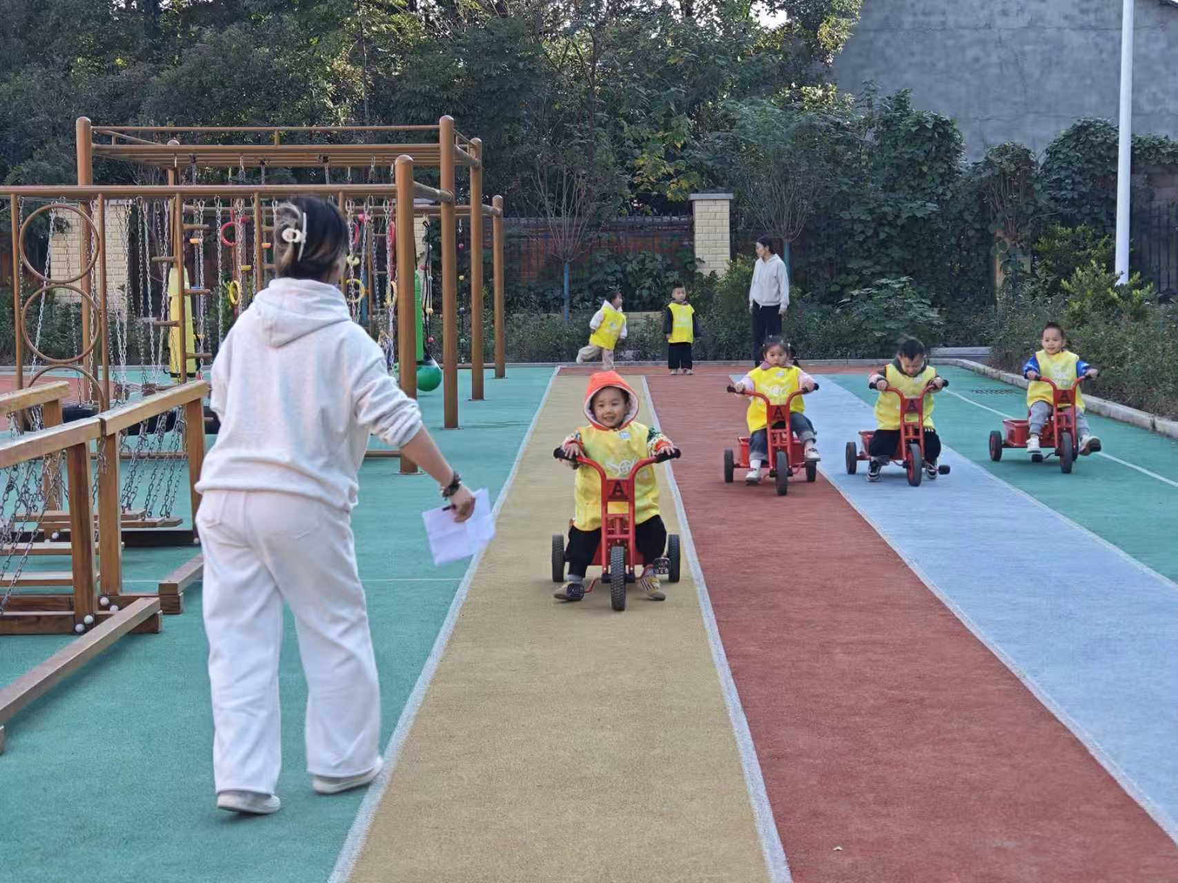 趣味比赛环节是本次运动会的核心亮点。活动按小托班组、中班组、大班组依次开展,分为个人赛与小组赛两大类别,兼顾趣味性与参与性。托小班的“球宝快跑”“勇投沙包”让孩子们在游戏中锻炼手眼协调能力;中班组的“一分钟拍球”“快乐接力”考验着幼儿的速度与协作;大班组的“跳绳高手”“越过障碍跑”则展现出孩子们的运动技能与拼搏精神。此外,“零食大作战”班级趣味赛更是将气氛推向高潮,五名老师代表班级奋勇争先,双手环抱零食往返冲刺,引得现场掌声与欢呼声不断。比赛过程中,老师们分工明确、全程护航,确保各项赛事公平公正、安全有序进行,孩子们在竞技中学会合作,在挑战中收获自信。