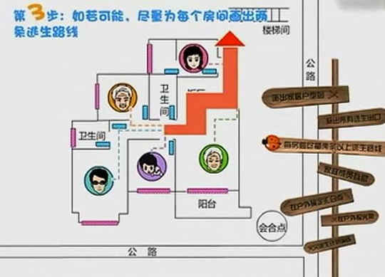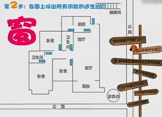 尽量为每个房间画出两条逃生路线,第一条可经房门出去,通向阳台、楼梯等安全疏散通道;第二条路线(只适合较低楼层),若房门被大火和浓烟封堵,可从窗户出去。要确保家里的窗户能自如开启,并且每个人都清楚逃生路线。