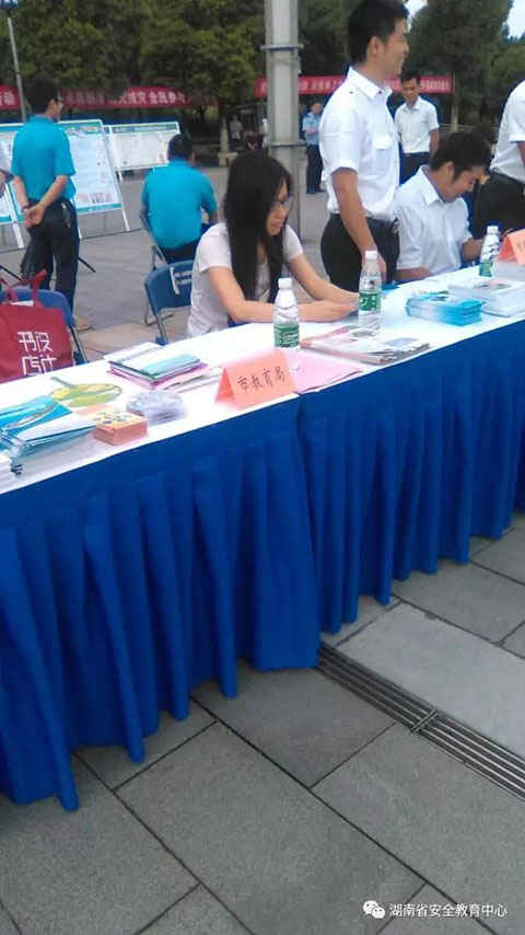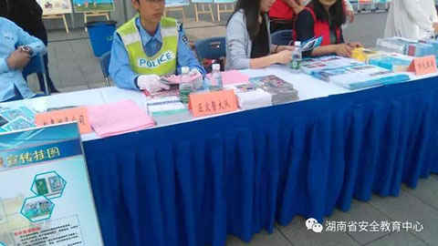 图:湖南省安全教育中心提供的安全知识读本在长沙市教育局展台受到群众欢迎。例如 以下图一市教育局展台、图二区交警队的展台等