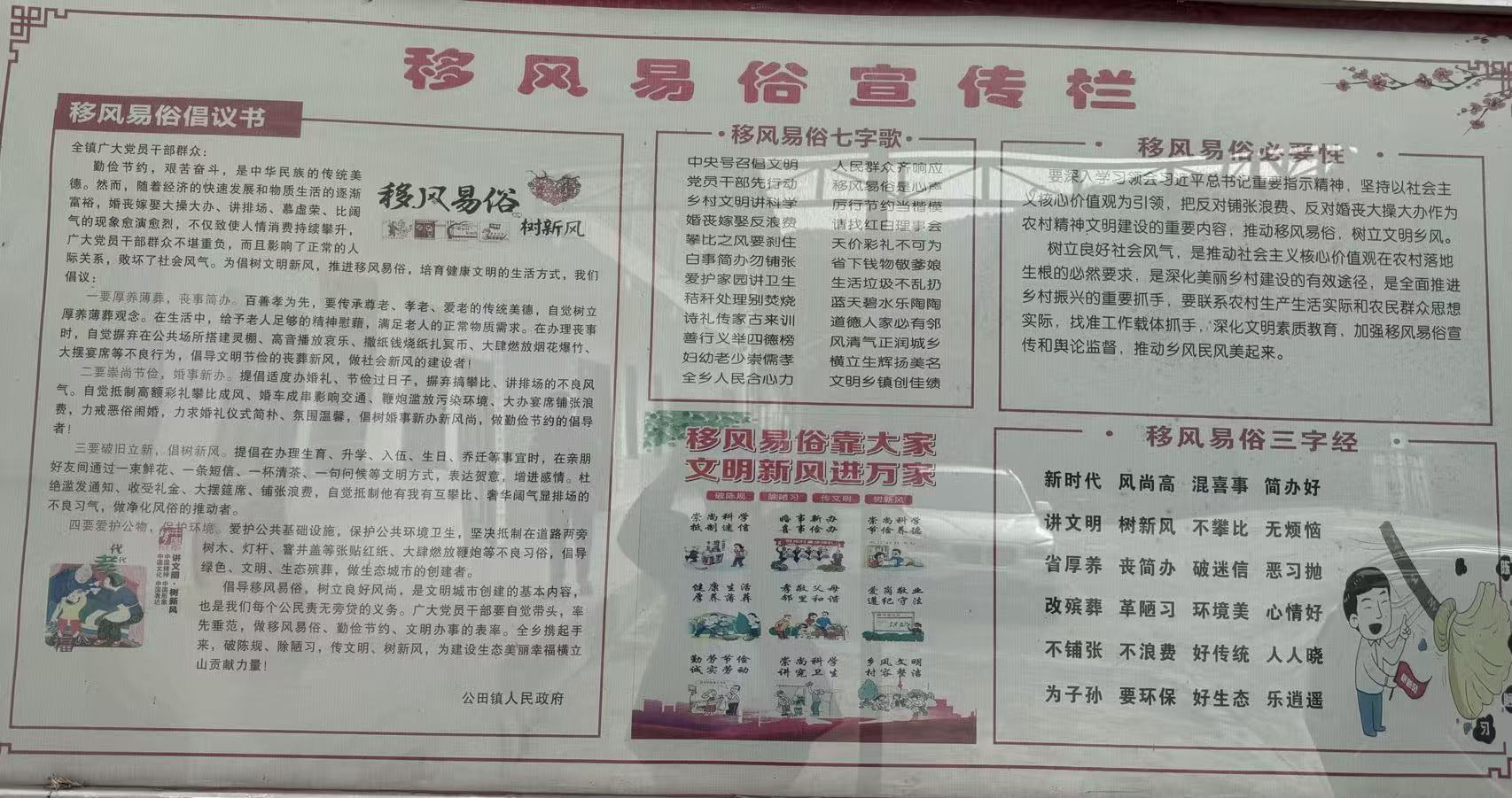 乡风文明方面,“移风易俗宣传栏”以倡议书、七字歌、三字经倡导文明新风,推动“婚事新办、丧事简办”成为共识。