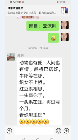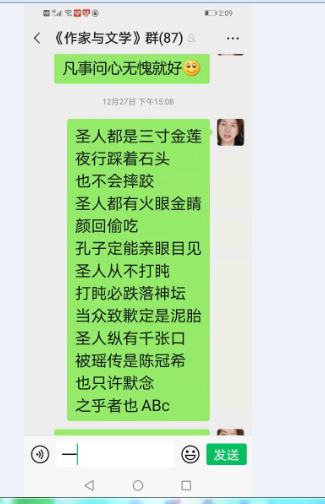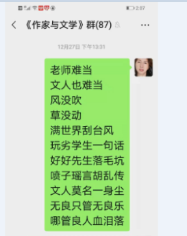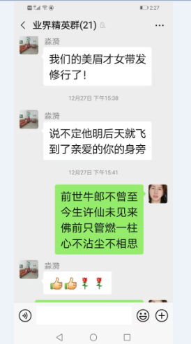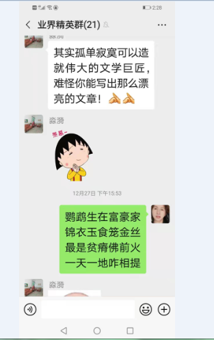 备注:12月27日,在业界精英群,和美女才子淼漪群聊开玩笑时,喻贵南即兴作了以上诗三首,以下两首诗同样于12月27日作于《作家与文学》群