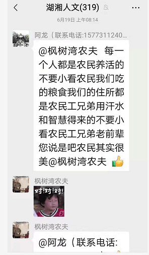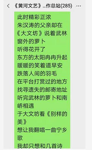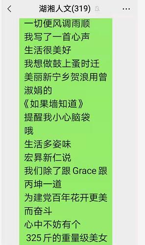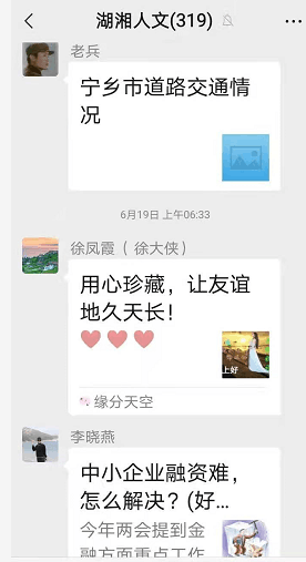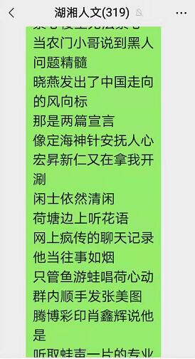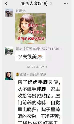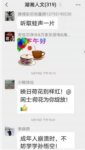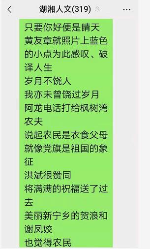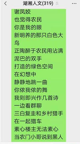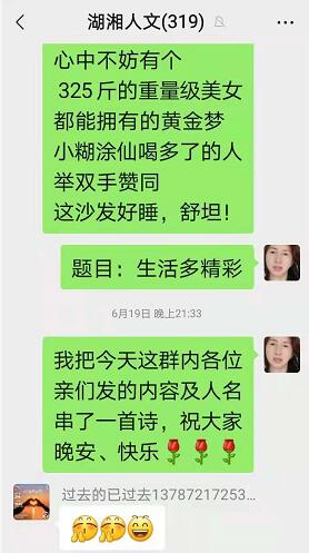 “湖湘人文”群内,第一二条群消息都是枫树湾农夫发出来的,于早上6:16,一篇说的是“丑父”,另一篇是头条上说到隐姓埋名25年的两弹一星,接下来群内发消息的是老兵,发的是宁乡市的交通情况,再接着是徐大侠发的消息……我便按时间顺序,将他们的人名及所发内容同样串成一首诗。题目为:《生活多精彩》