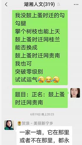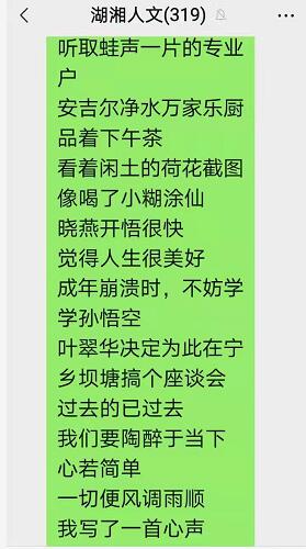 早几天,也就是2021月6月16日,群聊时,我所作的九首诗附图片在群内分享时,宁乡作家群内,素不相识的思妹子说我是才女,我即兴赋诗一首《偶不自才杀me集》,附湖南宁乡市方言
