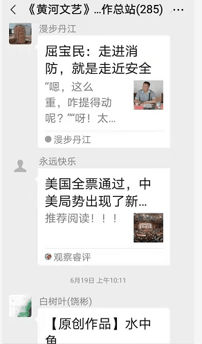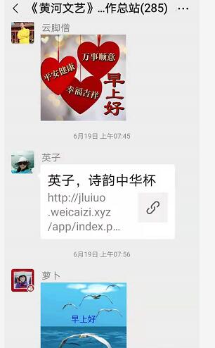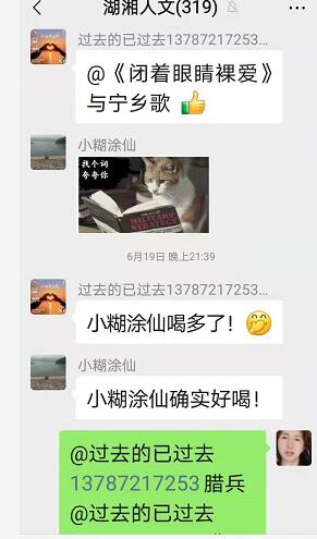 2021年6月19日,我在群内分享文章时,群聊时,我即兴作诗八首,其中三首为屏录群聊串诗,即:将一个群内当天所有人发文的内容和人名按顺序连成一首诗。