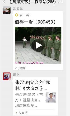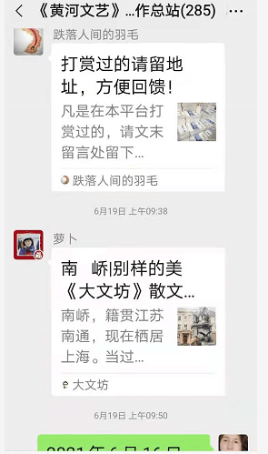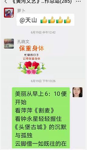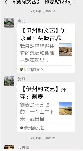 《黄河文艺》新疆工作总站”内,第一二条群消息都是美丽发出来的,于早上6:10,一篇说的是“割麦”,另一篇是头条上说的是“头堡古城”。