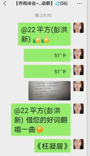 我说:似乎好像大概有点像纪实性小说了哈,同时,我在群里翻唱了一曲。