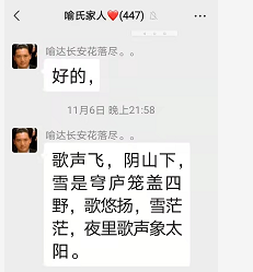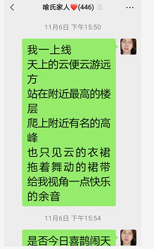 11月6日下午15:41,喻氏家人群,我在群里学一个家门说话,我说他们的话,太快太快了,就像下雨的天,劈哩啪啦 ,下雨下得很急很急。