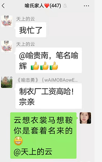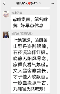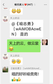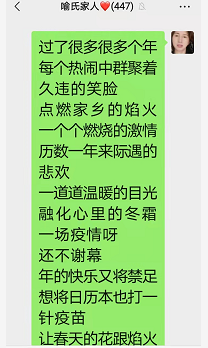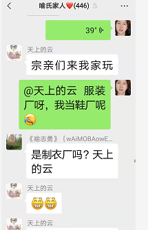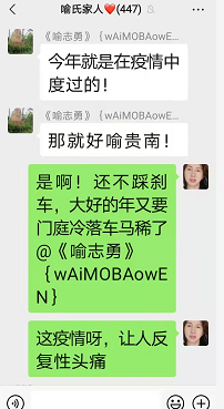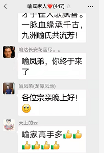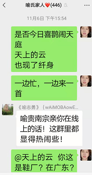 群里有点赞的,有聊及天上的云所在的工厂,也有聊到疫情,宗亲喻志勇说,他去做核酸检测了,他说今年就是在疫情中度过的!