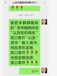 中午12:56,我把本群群昵称“京华烟雨诗词”以及“笑口常开”的网名,还有“虎年”两字嵌入其中,作七绝一首: