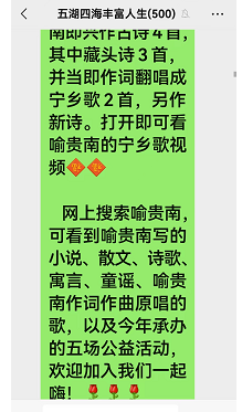 (注:网上搜索喻贵南,即可见到喻贵南写的小说、散文、诗歌、寓言、童话、童谣、喻贵南作词作曲原唱或翻唱的歌,以及相关活动。)