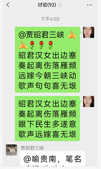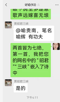 两首皆为七绝,第一首,我把(贾昭君三峡)此网名中的“昭君”“三峡”嵌入了诗中