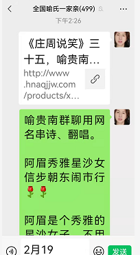 同样是2月19日,全国喻氏一家亲(群名),下午2:26,我在群内发文《庄周说笑》