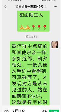 诗意:微信群中点赞的和其他宗亲一样,亲如近邻,朝夕相处,一低头便从手机中看得到,可真碰面了,才发现对方是从未见过的人,站在面前,都不认识 ,这就是数字化时奇异的现象,彼此间如此亲切却又如此陌生。