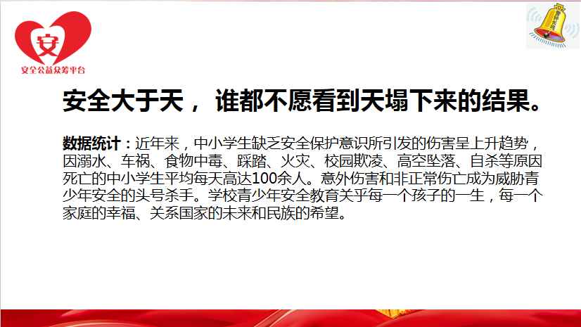 有专家指出:通过安全教育,安全管理提高中小学生的自我保护能力, 80%的意外伤害将可以避免。