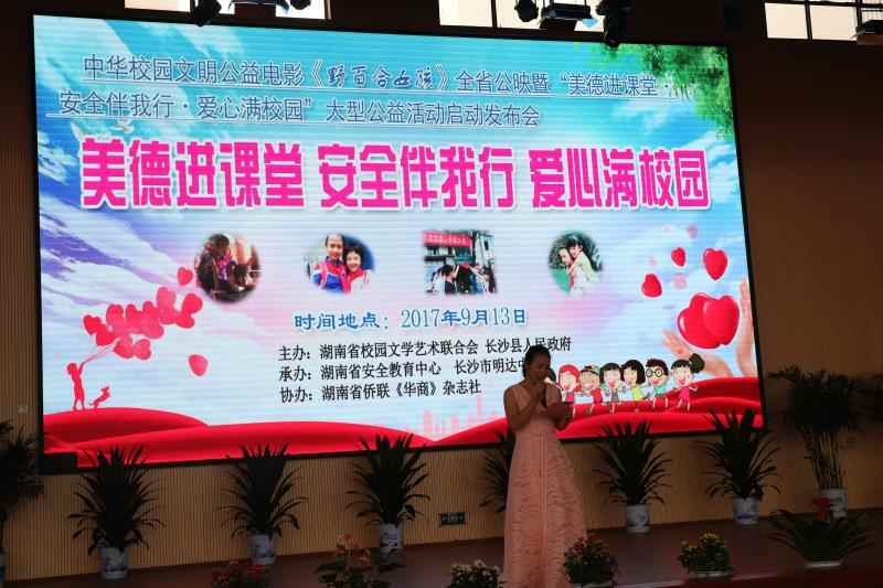 这次活动的主题是美德进课堂,安全伴我行,爱心满校园。关心少年儿童思想道德品质建设,关注学生安全,共享和谐生活。具体內容是举行校园文明电影《野百合女孩》公映式,捐赠《安全知识教育读本》和爱心助学金。来自长沙县黄兴镇的草根爱心人士谢勇怀着感恩之心,在明达中学捐赠放映电影《野百合女孩》、捐赠《安全知识教育读本》、捐赠优秀学子,并表示将跟进捐赠在全省开展的“美德进课堂·安全伴我行·爱心满校园”大型公益活动。