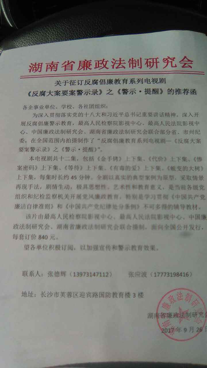 2017年9月26日,湖南省安全教育中心受湖南省廉政法制研究会的委托,向全省各企事业单位、学校、社团组织推广反腐倡廉教育系列电视视剧《反腐大案要案警示录》之《警示·提醒》。