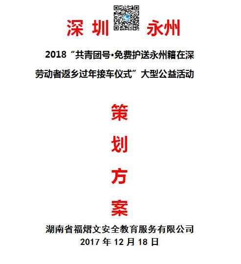 2018年“共青团号免费护送永州籍在深圳劳动者返乡过年”大型公益活动方案已出台,计划在今年青春快线的基础上,更有深度广度,更有特色。