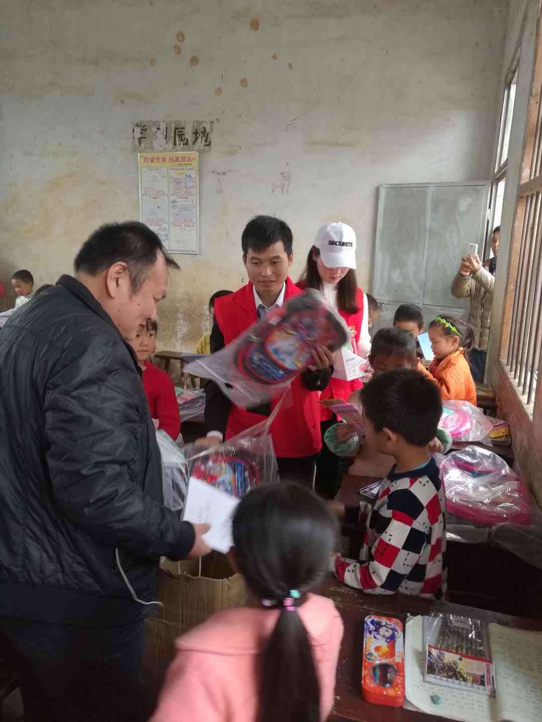 这次活动,大家为孩子们送去了书包、学习用品,一人一套,湖南省安全教育中心还给每个孩子赠送了一本中小学生《安全知识教肓读本》。
