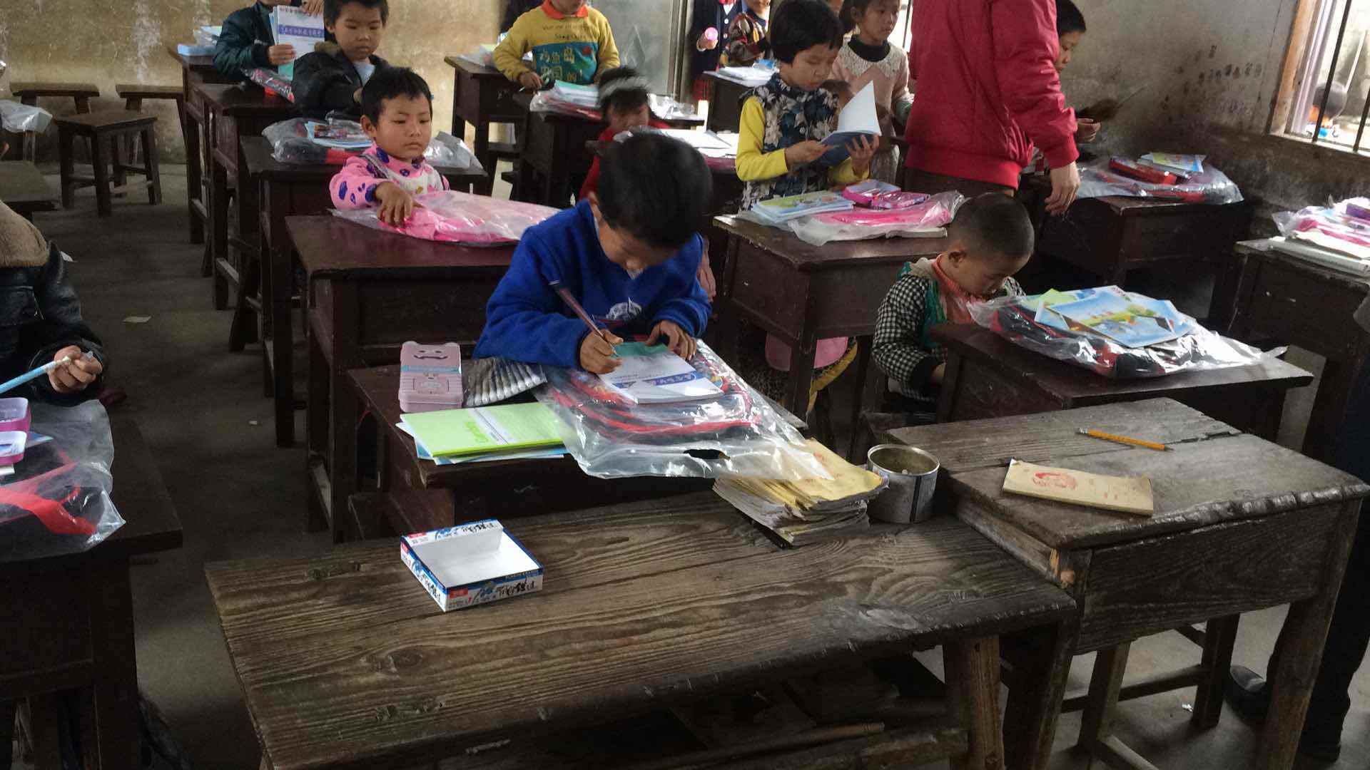 水口营小学地处偏僻,只有一位郑老师教学,郑老师有四十多年的教龄了,也上年纪了,有六十好几了,按常规早就退休了,因为当地比较偏远贫困所以调不过去老师,而郑老师又是当地的又舍不得孩子们所以一直坚持。孩子总共28名,一年级二年级一起一个教室一个老师一个班,一年级十人,二年级十人,学前班8名,典型的复式班。28名学生有22名是留守儿童基本上是由爷爷奶奶带,爸爸妈妈都在外打工。其中有13名家庭是特困户或贫困户