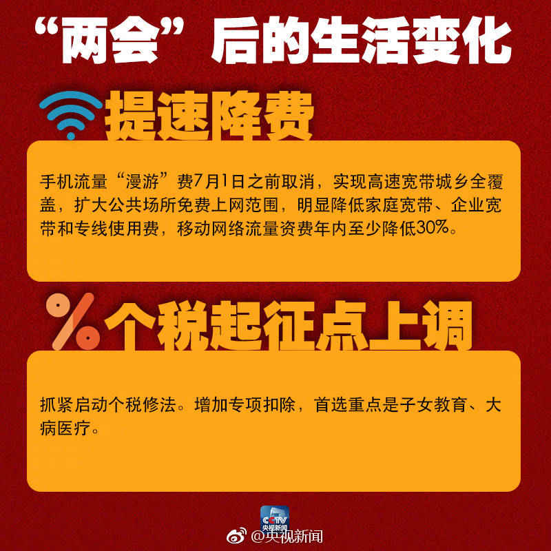 手机流量“漫游”费7月1日之前取消、个税起征点上调、提高基本医保和大病保险保障水平、加大公租房保障力度、稳步提高居民收入水平......根据今年总理记者会、“两会”期间多场记者会和政府工作报告的内容,你的生活将会有很多改变。