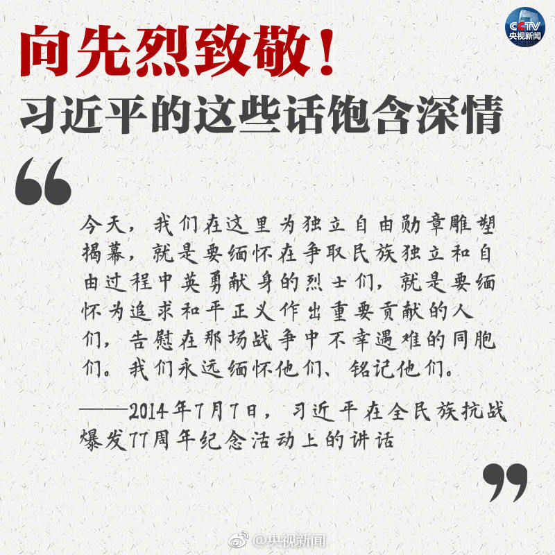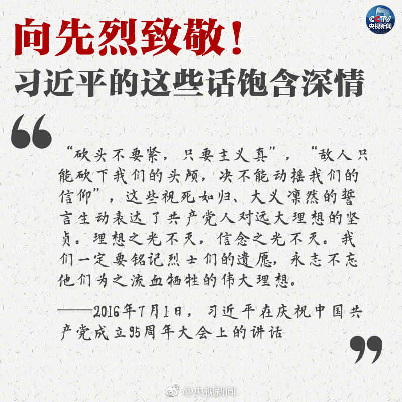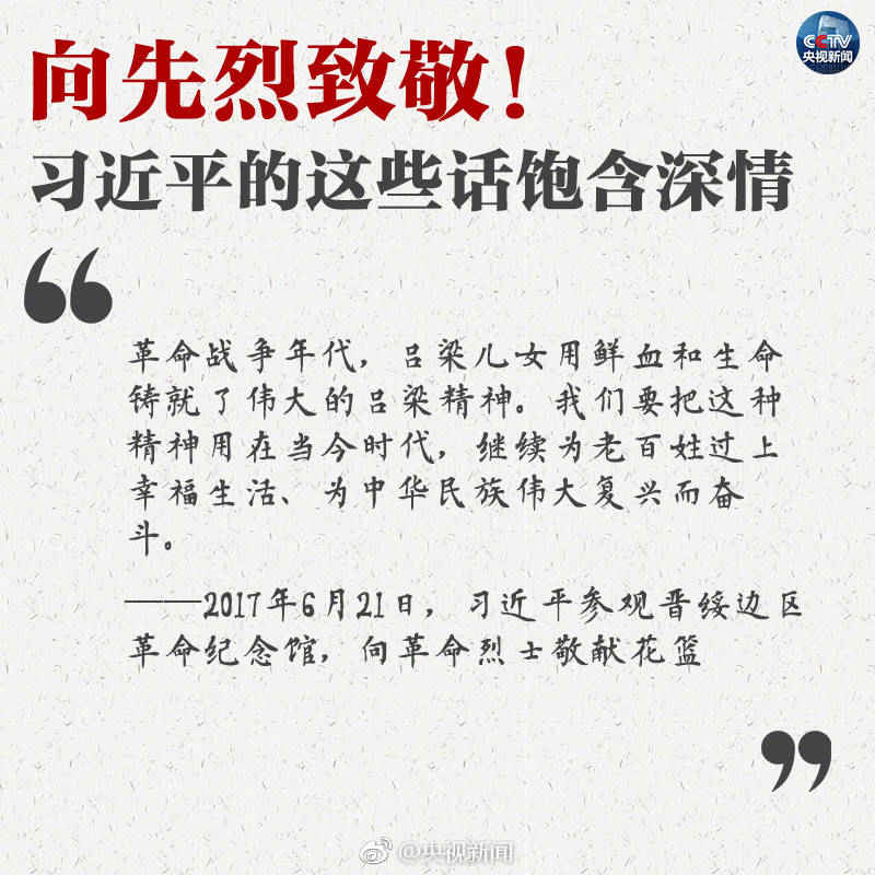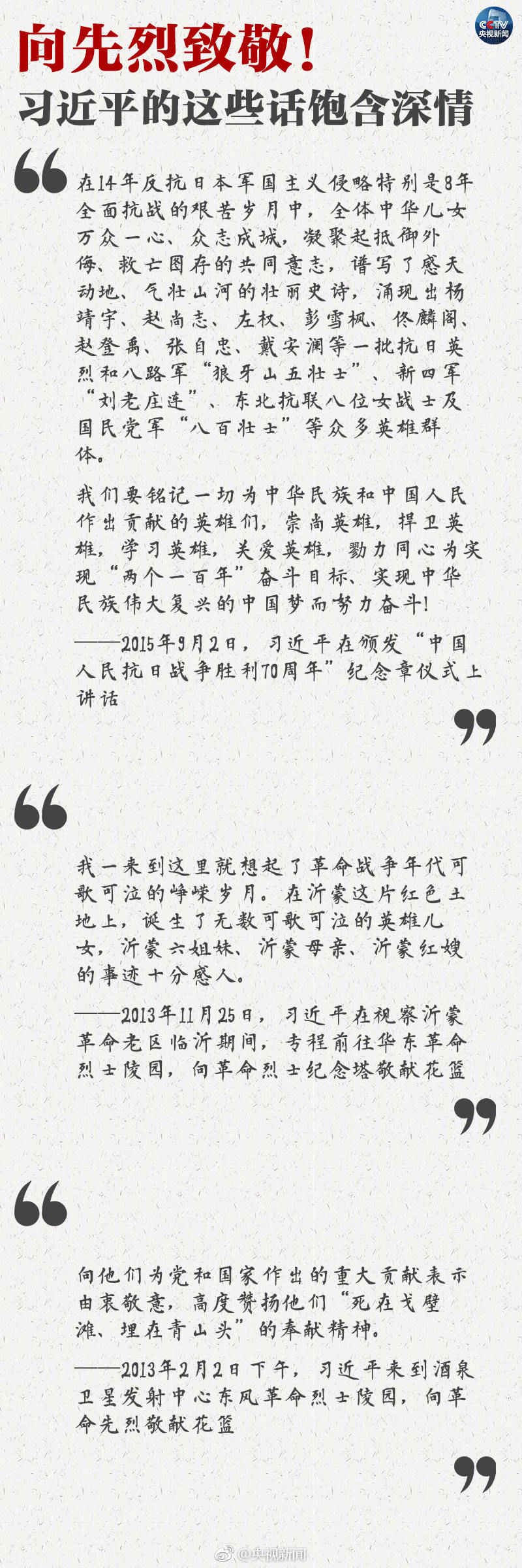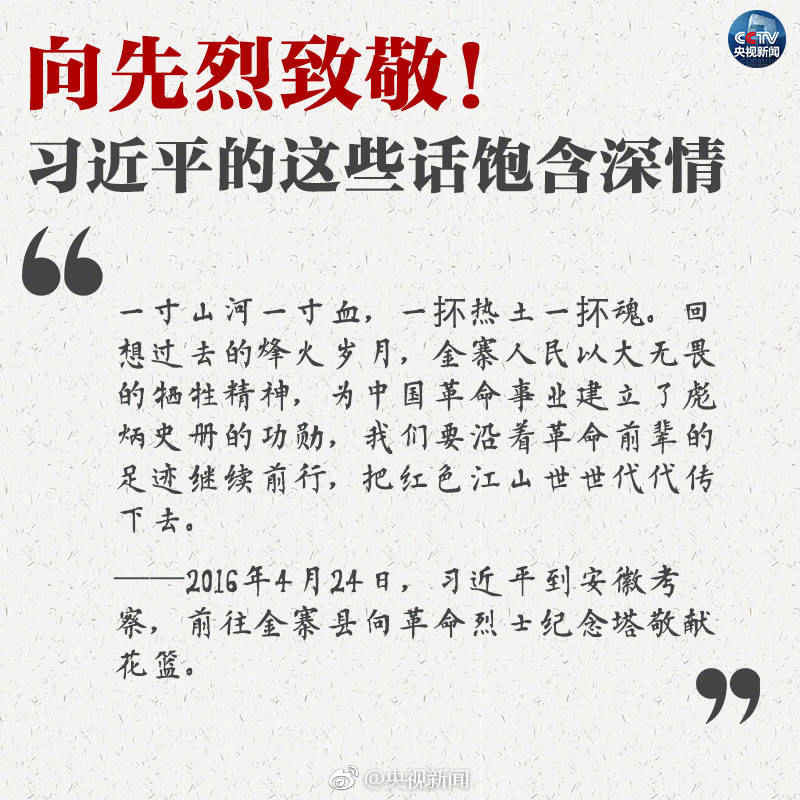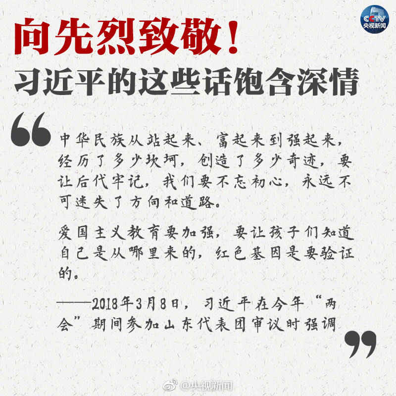今天,清明节,让我们重温习近平总书记在多个场合点赞英雄、缅怀先烈的话语,向他们致以崇高的敬意。