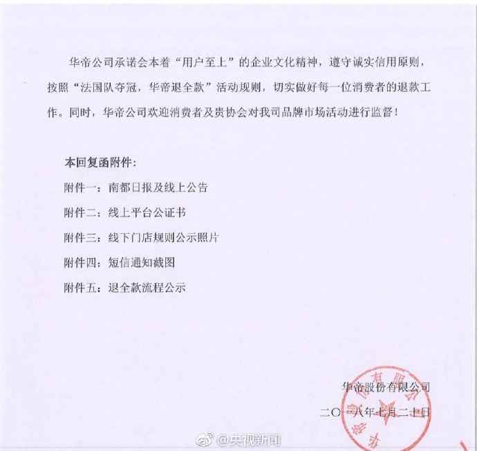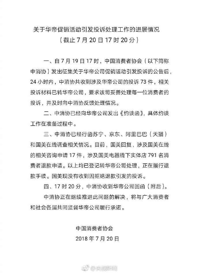 对“华帝用户退全款遇阻”一事,中消协今晚发布《关于华帝促销活动引发投诉处理工作的进展情况(截止7月20日17时20分)》,表示自发出征集投诉公告后,24小时内已收到相关投诉73件。中消协已经向华帝公司发出《约谈函》,约谈工作正在准备中。(央视记者王婧)