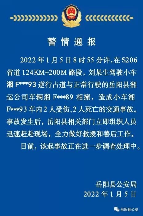 湖南岳阳县公安局5日在其官方微信发布警情通报称,2022年1月5日8时55分许,在S206省道124KM+200M路段,刘某生驾驶小车逆行占道与正常行驶的岳阳县湘运公司车辆相撞,造成小车内2人受伤、2人死亡的交通事故。