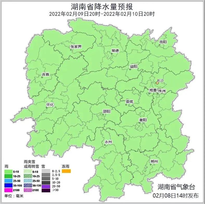 9日08时至9日20时,湘中及以北阴天有小到中雪,其中湘西州南部、常德南部、益阳、