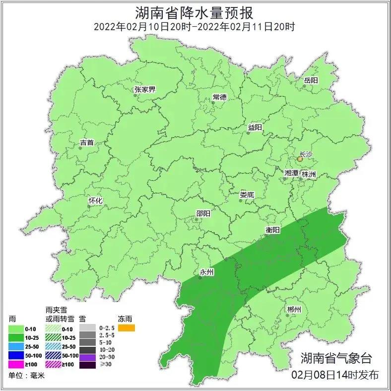 10日20时至11日20时,全省阴天有小雨,其中永州、衡阳中南部、株洲中部局地中雨,