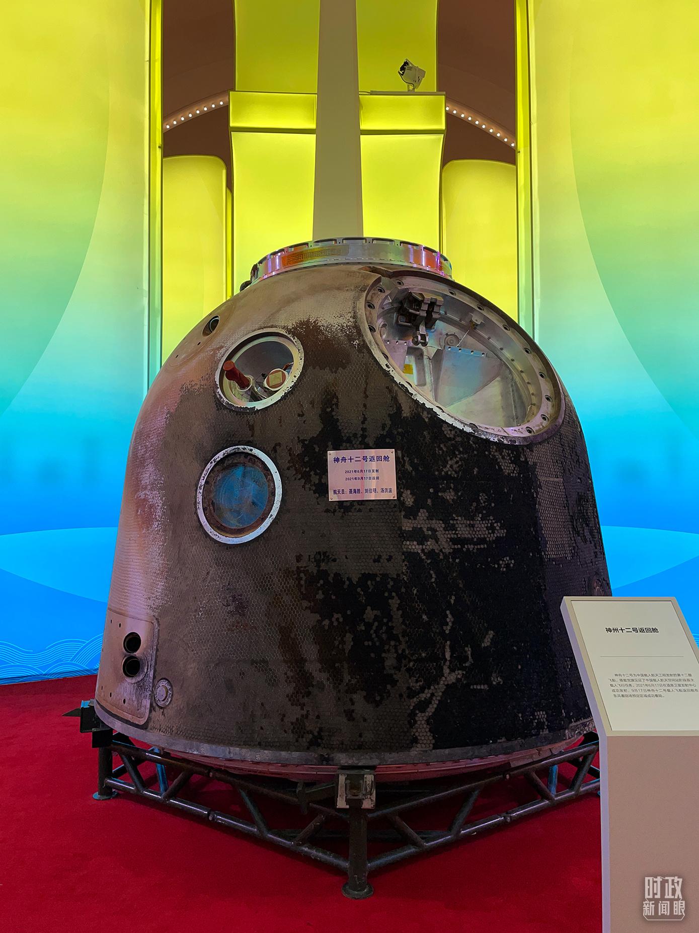 △“奋进新时代”主题成就展上,神舟十二号返回舱展示。(总台央视记者彭汉明拍摄)