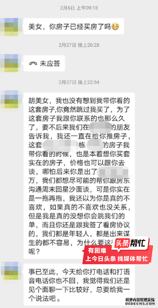 “我们在房子里也问过她确实是第一次看这个房子吗,她也明确表示是第一次看。我们签协议的时候也讲过,这个房子您要是第一次看,我们就带您看,如果不是第一次看,也可以提前告诉我们。”伍某某表示,他们并非无理取闹,去年冬天他们带胡女士看房子、跟房东谈价格,前前后后也花费了时间、付出了劳动,现在遇到这样的事,他们也感觉很不公平。“我们本身也是服务行业,也不希望跟客户去闹。”伍某某还称,他们多次提出希望与胡女士当面沟通解决此事。