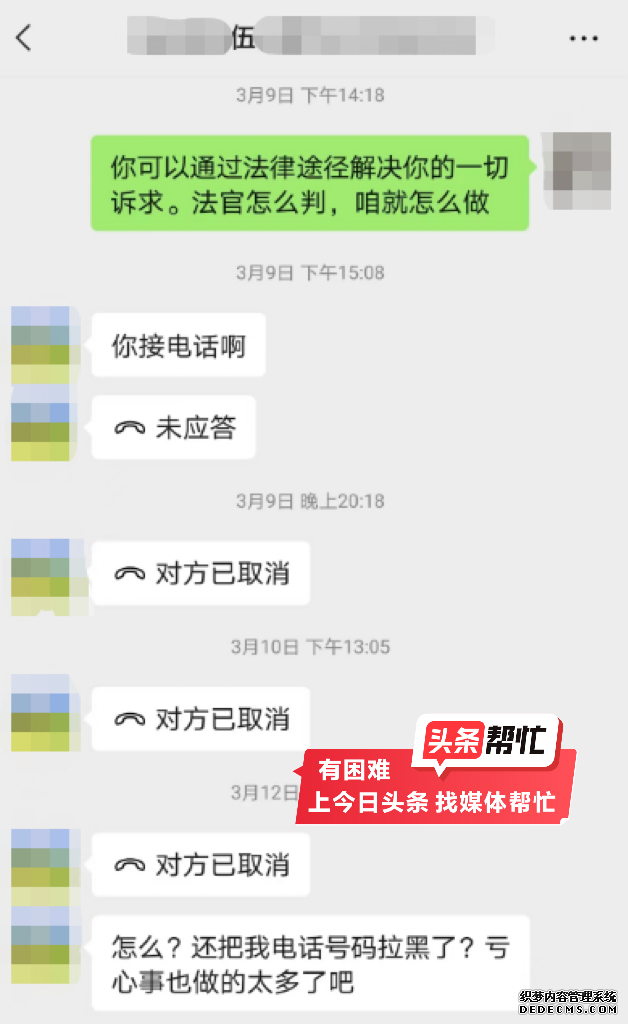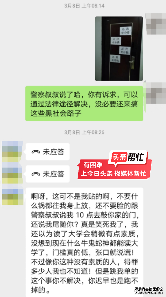 “如果她有证据,你可以让她拿出证据去找贴条的人,不要打电话来找我。我跟派出所的人已经很明确地讲了,不是我贴的。”4月2日下午,晨意帮忙记者联系到房地产中介伍某某,伍某某否认骚扰、贴纸条一说,还表示自己才是此事的受害者。“这个事情派出所已经介入了,她在我们这边看了房子,这是属于跳单的一个行为,我们已经走法律程序了,我们是走正规的法律流程,所以不存在这种(威胁)。”伍某某说道。