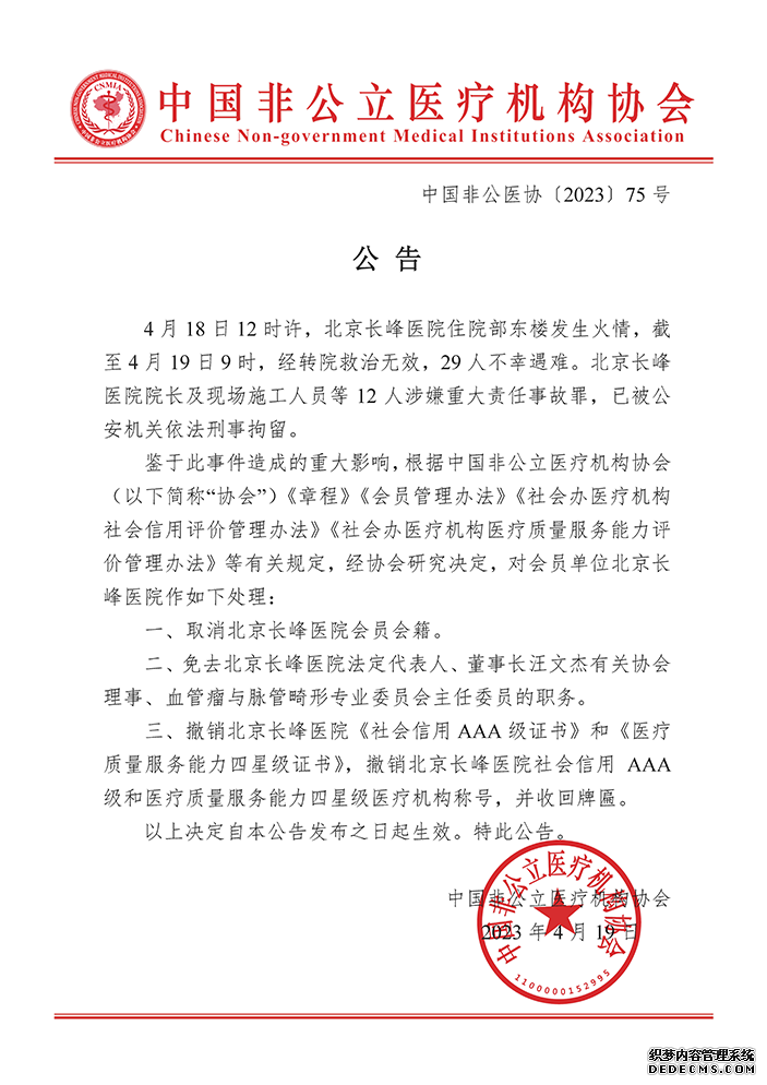 中国非公立医疗机构协会:取消北京长峰医院会员会籍