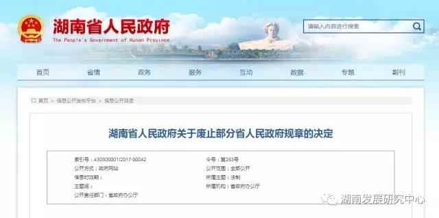 10月11日,湖南省政府网站公布《湖南省人民政府关于废止部分省人民政府规章的决定》,决定从2017年10月10日起废止34件省政府规章。