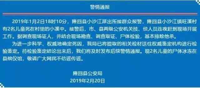 1月5日,隆回县公安局发布警情通报称,1月2日18点10分,隆回小沙江派出所接到群众报警,2名儿童死在村里的小溪中,经调查,警方已基本排除他杀,具体死因正在做进一步检验鉴定。