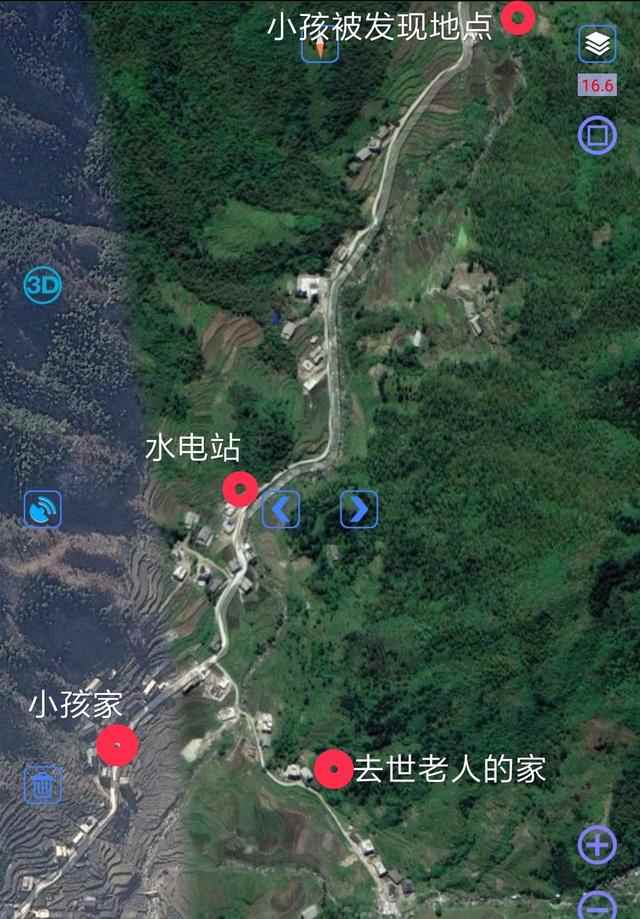 爷爷陆吉元两点半“吃席”的时候一直没有看到小孩,便匆匆吃完离开。他找了很久都没有看到孙子。下午4点多,他接到一个电话,说孩子在山上的溪中。“我就往山上走,但是走了一段路后看到没了脚印,就又往回走,遇到了小孩的2个堂叔以及一个村民,他们说‘小孩在上面,我们一起上去’”。