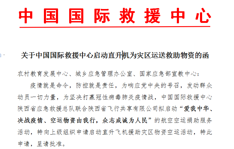 新型冠奖病毒疫情战:关于中国国际救援中心启动直升机为灾区运送救助物资的函