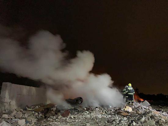 经过一夜的奋战,广汉金雁花炮厂爆炸现场的大火已经被扑灭。