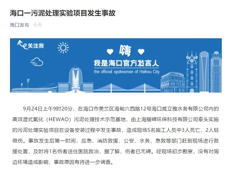据海口市人民政府新闻办公室微信公众号“海口发布”消息,9月24日上午9时20分,在海口市美兰区海甸六西路12号海口威立雅水务有限公司内的高效湿式氧化(HEWAO)污泥处理技术示范基地,由上海耀嵘环保科技有限公司牵头实施的污泥处理实验项目在设备安装过程中发生事故,造成现场5名施工人员中3人死亡、2人轻微伤。