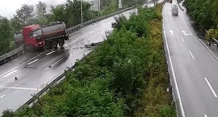 这两天的降温降雨天气也给出行带来不少隐患,雨天在高速公路行车得特别注意减速慢行。近日在G69银白高速观音岩隧道附近,一辆危化品车就因为下坡时车速过快,而驾驶员踩了一下刹车减速,车辆便发生侧滑撞向护栏险些掉下10多米高的边坡。