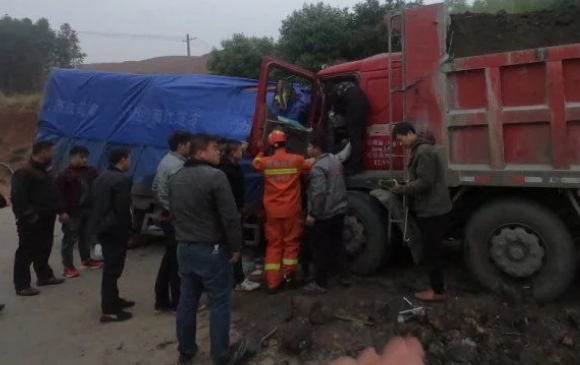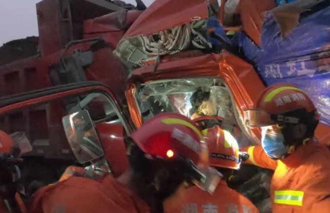 救援人员到达现场后,发现一辆满载砂石的重型半挂车与一辆运输白酒的小型货车迎面相撞,两车驾驶室严重变形。半挂车的驾驶员、小型货车的驾驶员及副驾驶乘客被困车内,所幸三人均意识清醒,只是双腿卡在车内无法动弹。