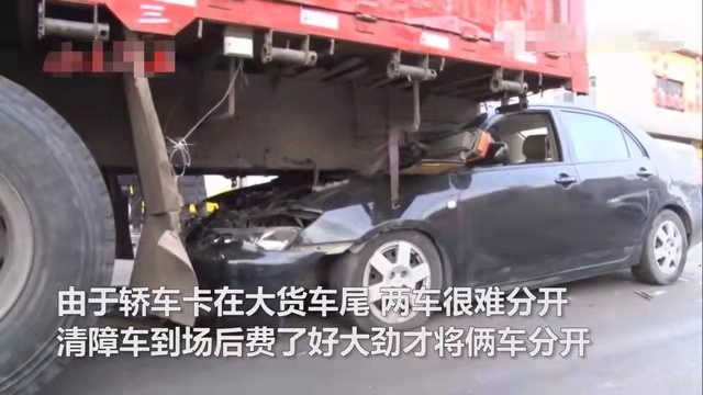 事故发生后,当地交警部门已第一时间赶到了现场处置。据了解,当时大货车经过路口时,依法减缓车速等待红灯,但小轿车似乎是毫无察觉红灯及前方放缓车速的大货车,直接一头扎进大后车的尾部。