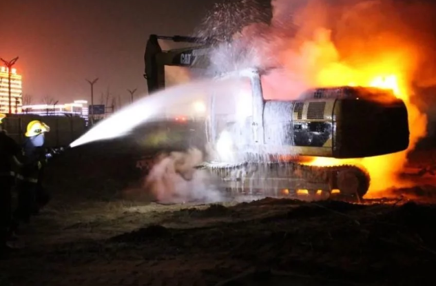 由于工地周围被铁皮挡板所包围,消防车无法停靠到距离挖掘机较近的位置。消防救援人员利用斧头将铁皮破拆出一个豁口,然后通过该豁口进入工地里面。在距挖掘机3米左右处设置水枪阵地,随后用水枪出水和泡沫对挖掘机上的明火进行压制,并对挖掘机油箱进行冷却降温。经过近20分钟的紧张扑救,明火被成功扑灭。