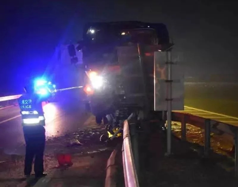 司机深夜驾车“打个盹儿”,货车撞到高速出口护栏上