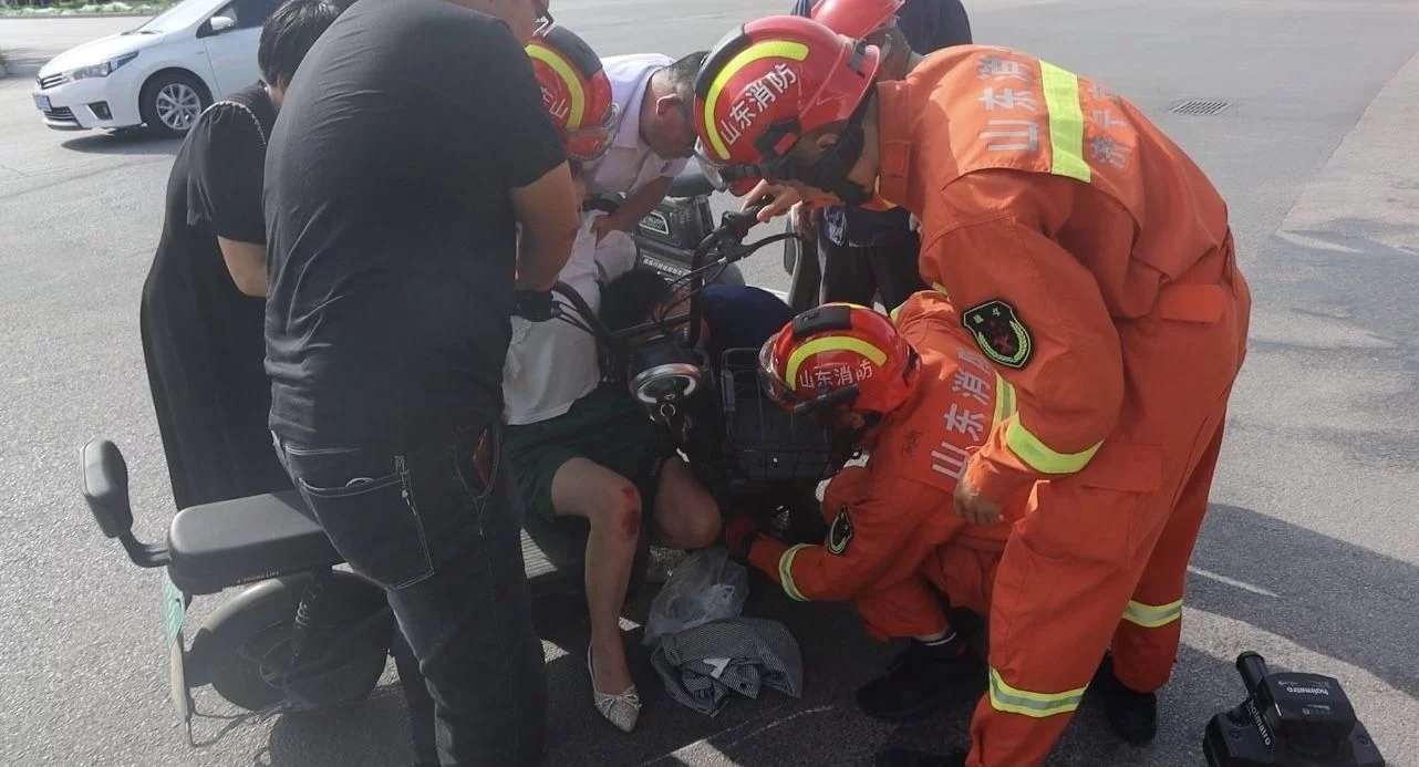 女子骑电动车摔倒腿被卡 济宁消防员火速救援